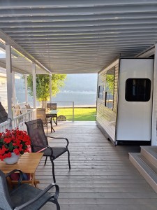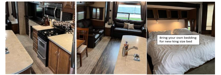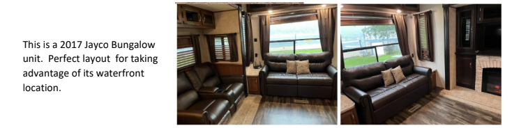 - Roomy living area with water view, includes 2 recliner chairs, sofa, 4 seater dinette, island with sink and cabinets, fully stocked kitchen (including toaster, blender, kettle, coffeemaker), full size refrigerator, microwave and a toaster oven.