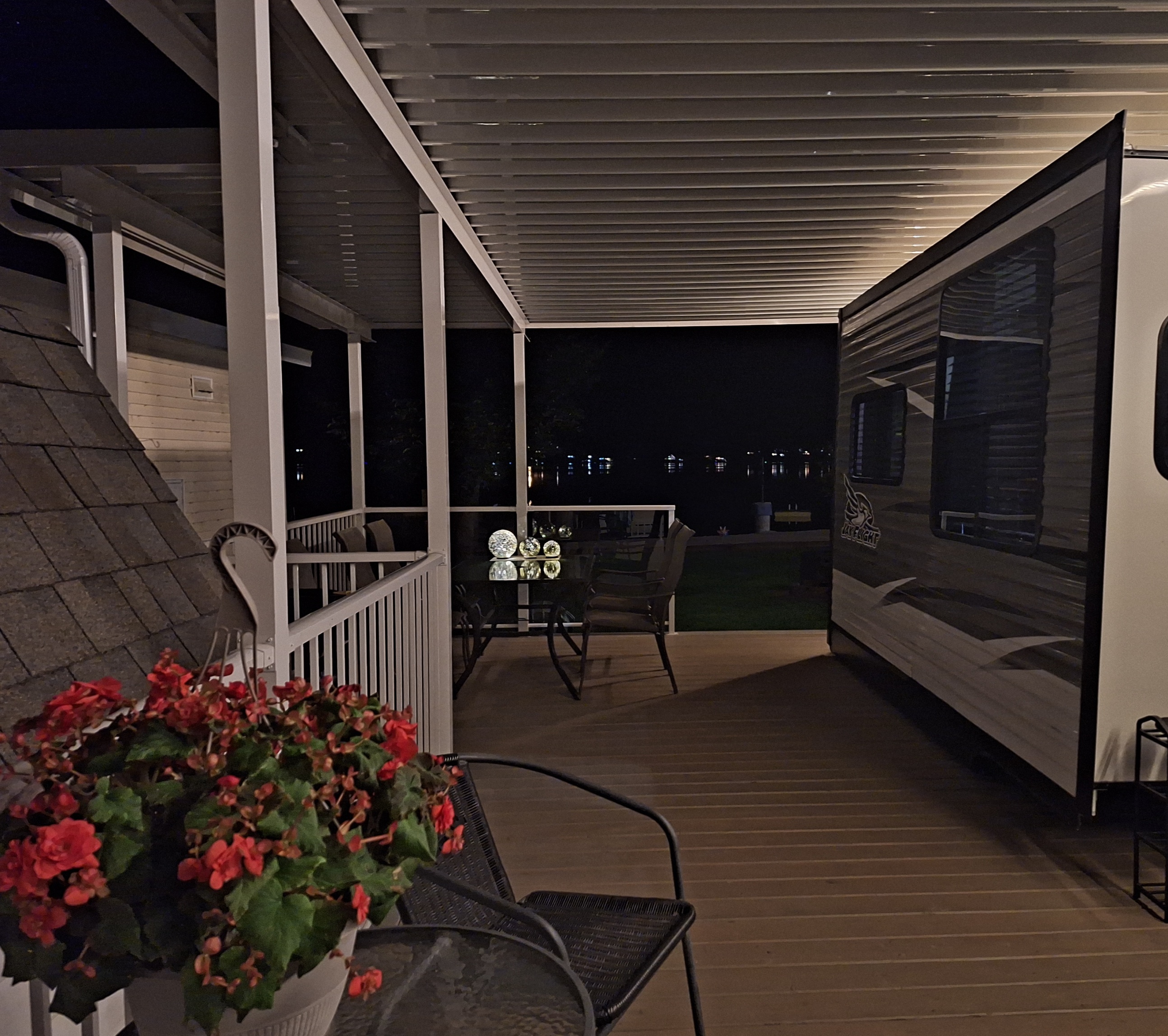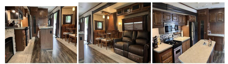 - Roomy living area with water view, includes 2 recliner chairs, sofa, 4 seater dinette, island with sink and cabinets, fully stocked kitchen (including toaster, blender, kettle, coffeemaker), full size refrigerator, microwave and a toaster oven.